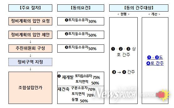 복잡한 행정절차, 동의 확보는 최대한 한번에, 미리 처리할 수 있게 하고, 조합이 확보해야 하는 국ㆍ공유지 확보 부담을 완화할 수 있도록 규제 합리화 방안을 담았다.