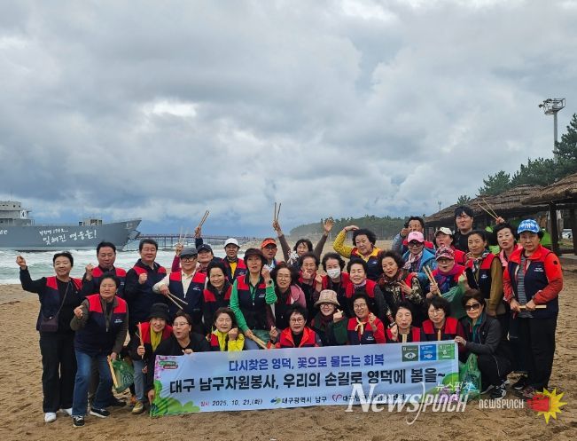 뉴스펀치 조평훈 기자 | 대구 남구는 지난 10월 21일 대구남구자원봉사센터와 함께 자원봉사자 40명이 올해 3월 대형 산불 피해를 겪은 경북 영덕지역에서 재난대응 중심 봉사활동을 펼쳤다.