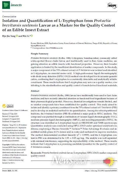 농촌진흥청은 이번 연구로 꽃벵이 추출물의 뼈 건강 개선 지표성분이 L-트립토판임을 밝히고 국제학술지 Insects(IF 2.9)에 논문으로 게재했다. 이로써 꽃벵이를 활용한 기능성 소재 표준화와 품질관리 체계 확립의 과학적 근거를 마련했다.