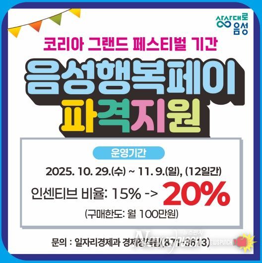 뉴스펀치 김길룡 기자 | 음성군은 오는 29일부터 11월 9일까지 12일간 실시되는 국가 단위 할인 축제인 ‘코리아 그랜드 페스티벌’ 기간 음성행복페이의 인센티브 지급을 기존 15%에서 20%로 상향해 운영한다고 밝혔다.