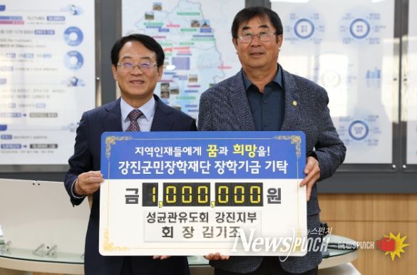 뉴스펀치 김길룡 기자 | 풍요의 계절 10월, 강진군민장학재단에 미래인재 육성 장학금을 기탁하는 뜻깊은 자리가 마련됐다. 지난 22일 강진향교 안종희 전교, 성균관유도회 강진군지부 김기조 회장이 각각 100만원을 강진군민장학재단에 기탁했다.