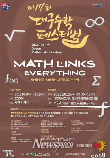 뉴스펀치 조평훈 기자 | 대구시교육청이 주최하고 대구중등수학교육연구회가 운영하는 ‘제17회 대구수학페스티벌’이 10월 25일 9시 30분부터 대구과학고 및 대구창의융합교육원에서 'Math Links Everything(수학은 모든 것을 연결한다)'이라는 주제로 개최된다.