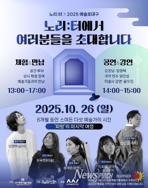 뉴스펀치 조평훈 기자 | 대구문화예술진흥원 문화예술본부는 ‘2025 예술인파견지원사업–예술로 대구’의 일환으로, ‘노리:터’와 협력해 추진한 예술 협업 프로젝트의 마지막 무대인 ‘선과 흥을 따라서: 김홍도와 신윤복’을 오는 10월 26일 오후 2시부터 개최한다.