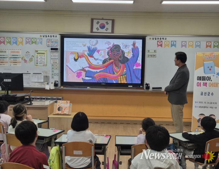 뉴스펀치 김길룡 기자 | 박범인 금산군수는 지난 24일 남일초를 방문해 학생들과 함께 그림책 읽는 시간을 가졌다.