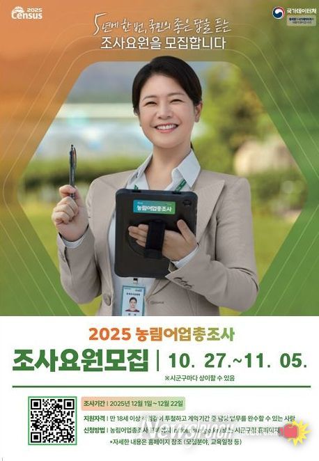 뉴스펀치 김길룡 기자 | 화순군은 '2025 농림어업총조사를 위해 오는 10월 27일부터 11월 5일까지 조사요원을 모집한다고 밝혔다.