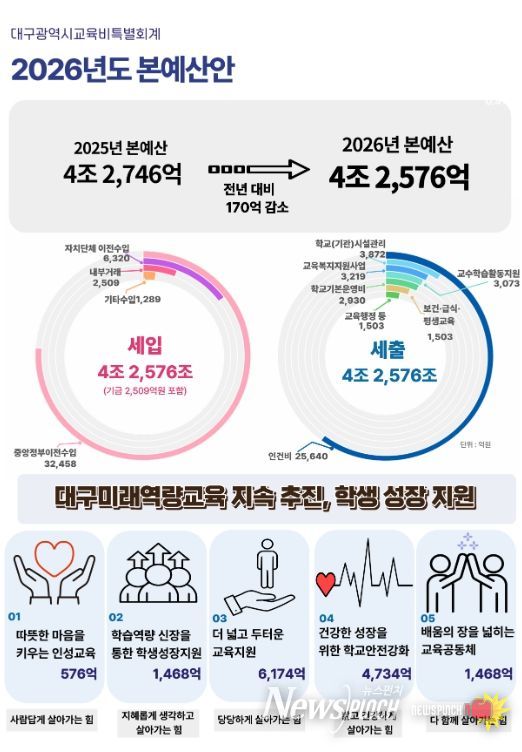 뉴스펀치 조평훈 기자 | 대구시교육청은 2026년도 대구광역시교육비특별회계 예산안을 올해 예산보다 170억 원 감액된 4조 2,576억 원으로 편성해 10월 27일 대구시의회에 제출했다고 밝혔다.