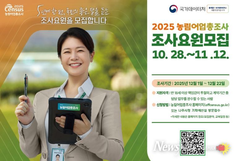 뉴스펀치 김길룡 기자 | 전라남도 나주시가 지역 농림어업 현황을 정확히 파악하기 위한 ‘2025 농림어업총조사’의 원활한 추진을 위해 조사요원을 모집한다.
