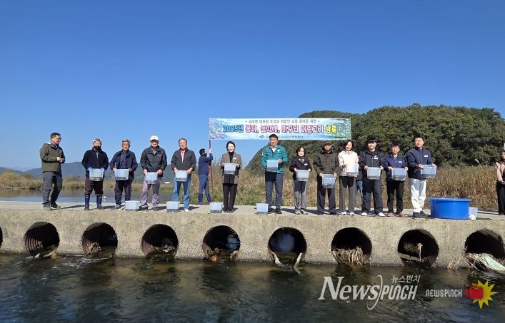 뉴스펀치 김길룡 기자 | 고령군은 29일 낙동강 지류인 운수면 대평리 회천 일원에서 경상북도의회(도의원 노성환), 경상북도 토속어류산업화센터, 운수면 대평리 주민들이 참여한 가운데 붕어, 동자개, 미꾸리 어린고기 13만미와 다슬기 치패 13만 마리를 방류했다.
