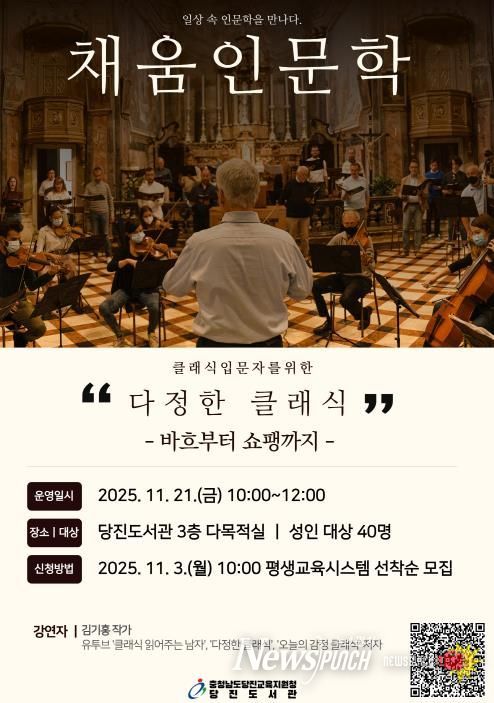뉴스펀치 김길룡 기자 | 충청남도당진교육지원청당진도서관은 오는 11월 21일 오전 10시부터 12시까지 성인을 대상으로 한 인문학 프로그램 ‘채움인문학’을 운영한다.