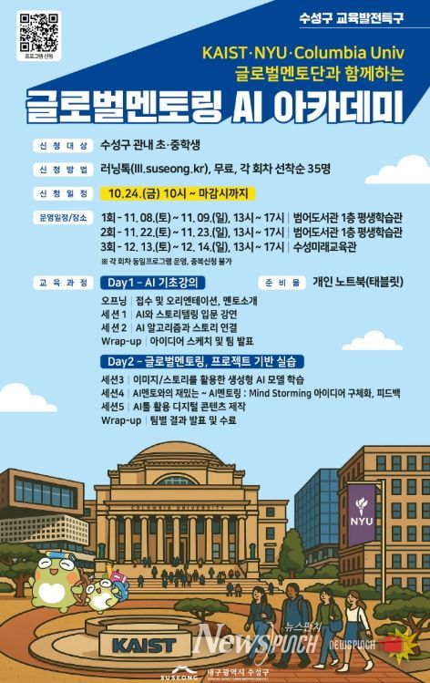 뉴스펀치 조평훈 기자 | 대구 수성구는 오는 11월 7일 범어도서관 김만용·박수년홀에서 ‘글로벌 교육 전문가와 함께하는 수성 AI 인재 미래교육 포럼’을 개최하고, 연계 프로그램인 AI 아카데미를 통해 미래세대를 위한 교육혁신과 글로벌 협력의 출발점을 연다.