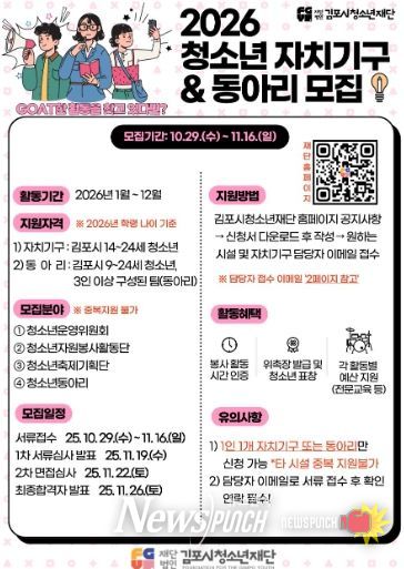 뉴스펀치 김길룡 기자 | (재)김포시청소년재단에서 2026년 한 해 동안 김포시 청소년 수련시설을 함께 이끌어갈 청소년 자치기구 및 동아리 참여 청소년을 오는 10월 29일부터 11월 16일까지 모집한다.
