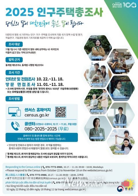 뉴스펀치 김길룡 기자 | 국가데이터처에서는 10월 22일부터 인터넷 및 전화조사를 통해 시작된 2025 인구주택총조사가 한창 진행 중이며, 11월 1일부터 11월 18일까지는 전국적으로 약 3만 여명의 통계조사요원이 가구를 방문하여 면접조사를 실시한다.
