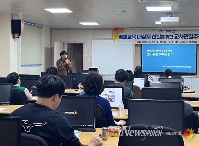 뉴스펀치 김길룡 기자 | 경상북도영천교육지원청은 10월 29일 오후 3시, 영천교육지원청 3층 컴퓨터실에서‘2026학년도 영재교육대상자 선발을 위한 교사관찰추천제 연수’를 실시했다.
