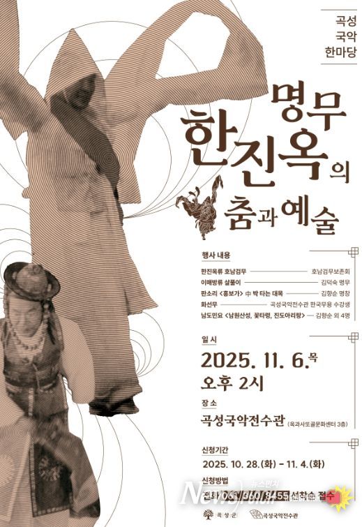 뉴스펀치 김길룡 기자 | 곡성군이 오는 11월 6일 오후 2시에 옥과면에 위치한 곡성국악전수관에서 곡성 국악 한마당 ‘명무 한진옥의 춤과 예술’ 행사를 개최한다.