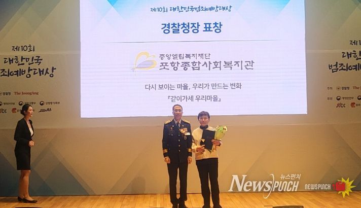 뉴스펀치 김길룡 기자 | 포항시는 지난 28일 중앙엘림복지재단 포항종합사회복지관이 경찰청과 중앙일보가 주최한 ‘2025년 제10회 대한민국 범죄예방대상’에서 셉테드(CPTED·범죄예방환경설계) 부문 경찰청장상을 수상했다고 밝혔다.