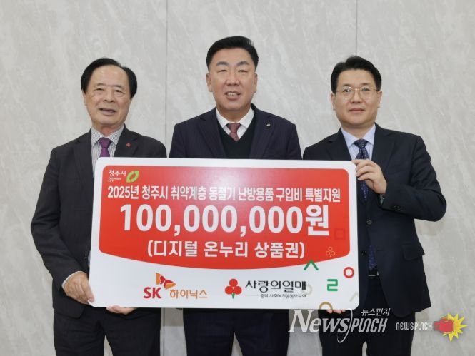 뉴스펀치 김길룡 기자 | SK하이닉스(주)(대표 곽노정)는 30일 청주 지역 저소득 가구의 난방용품 구입을 지원하기 위해 청주시에 1억원 상당 디지털 온누리상품권을 기탁했다.