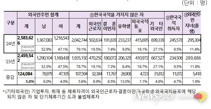 분석 결과에 따르면 2024년 11월 1일 기준, 3개월을 초과해 국내에 장기 거주한 외국인주민 수는 총 258만 3,626명으로 나타났다.