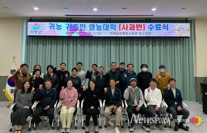 뉴스펀치 김길룡 기자 | 거창군은 10월 31일 거창군농업기술센터 내 미래농업복합교육관에서 교육생 30명을 대상으로 ‘2025년 귀농귀촌인 영농대학 사과반’ 수료식을 개최했다고 밝혔다.