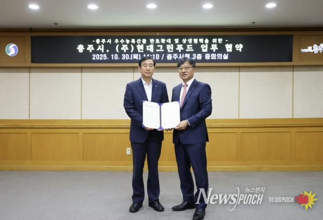 뉴스펀치 김길룡 기자 | 충주시가 지역 농특산물의 소비 기반 확대와 농가 소득 안정화를 위해 국내 대표 식품기업인 현대그린푸드와 손을 맞잡았다.