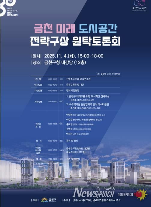 뉴스펀치 김완규 기자 | 금천구는 4일 오후 3시 금천구청사 12층 대강당에서 ‘금천의 미래 도시공간 전략구상 계획 수립을 위한 원탁토론회’를 연다고 밝혔다.