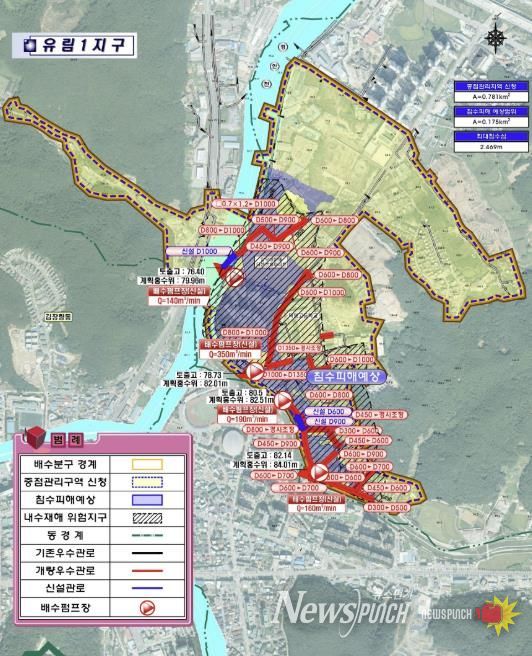 하수도정비 중점관리지역으로 지정된 ‘유림1지구 및 중앙지구’의 면적은 약 1.08㎢다. 이 지역은 하수관로의 통수 능력이 부족하고, 하천 수위가 상승할 경우 내수 배제가 어려운 지역으로 꼽혔다.