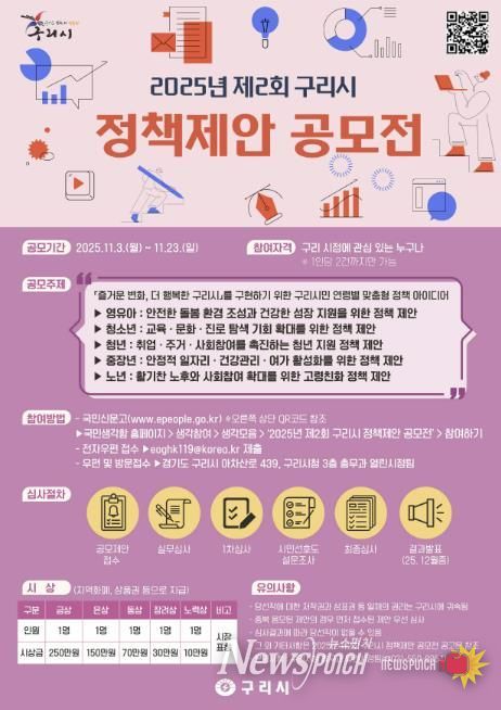 뉴스펀치 김길룡 기자 | 구리시는 오는 11월 3일부터 11월 23일까지'2025년 제2회 구리시 정책 제안 공모전'을 개최한다고 밝혔다. 이번 공모전의 주제는 ‘구리 시민(영유아·청소년·청년·중장년·노년) 나이별 맞춤형 정책 아이디어’다.