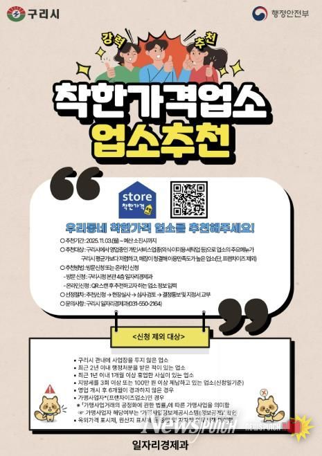 뉴스펀치 김길룡 기자 | 구리시는 물가 상승 등 어려운 경제 여건 속에서도 저렴한 가격과 친절한 서비스를 제공하는 지역 소상공인을 발굴하기 위해, 11월 3일부터 '우리 동네 착한가격업소를 추천해 주세요' 시민참여 캠페인을 전개한다고 밝혔다.
