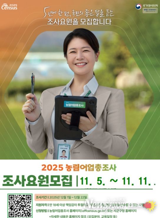 한편, ‘2025 농림어업총조사’는 인터넷조사는 오는 11월 20일부터, 방문조사는 12월 1일부터 12월 22일까지 본격 실시될 예정이다.