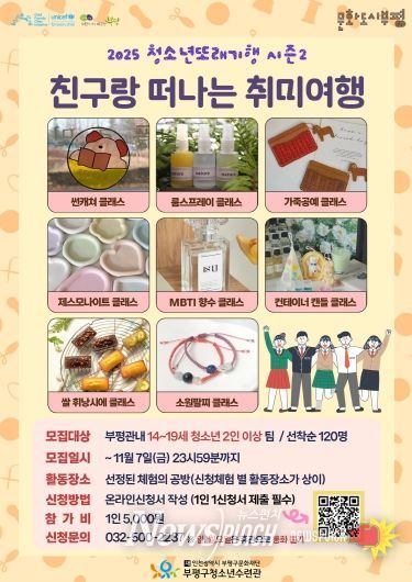뉴스펀치 김길룡 기자 | 부평구 청소년수련관은 오는 7일까지 ‘2025 청소년 또래기행 시즌2-친구랑 떠나는 취미여행’에 참여할 청소년을 모집한다.