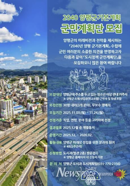 뉴스펀치 김길룡 기자 | 양평군은 3일부터 24일까지 미래 양평의 청사진을 그릴 ‘2040년 양평 군기본계획’ 수립을 위해 군민과 함께하는 ‘도시정책 군민계획단’을 모집한다고 밝혔다.