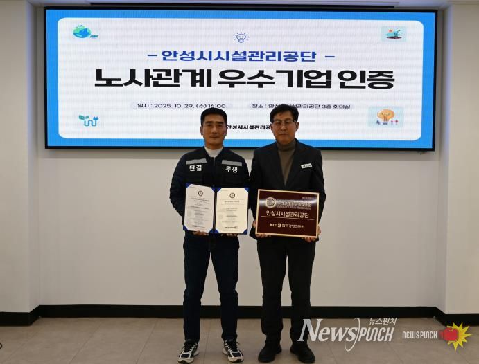 뉴스펀치 김길룡 기자 | 안성시시설관리공단은 안성시시설관리공단 노동조합과 함께 상생과 신뢰를 기반으로 한 모범적인 노사문화를 인정받아 ‘노사관계 우수기업’ 인증을 획득하했다고 밝혔다.
