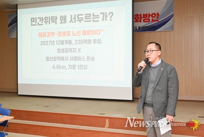 뉴스펀치 김길룡 기자 | 울산광역시의회 손근호 의원(산업건설위원회)은 3일 오후 의회 3층 회의실에서 진보당과 시민연대와 공동으로 울산의 공공교통 전환 토론회를 개최했다.
