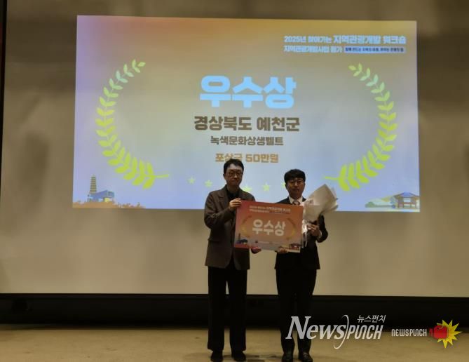 뉴스펀치 김길룡 기자 | 예천군은 ‘2025년 찾아가는 지역관광개발 워크숍’에서 ‘녹색문화 상생벨트(삼강문화단지 조성사업)’이 지역관광개발사업 우수상을 수상했다고 밝혔다.