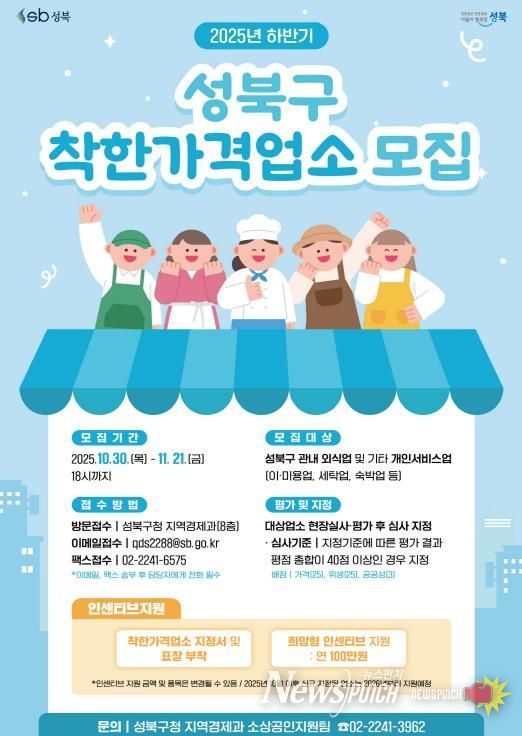 뉴스펀치 김완규 기자 | 서울 성북구가 10월 30일부터 11월 21일까지 착한가격업소를 신규 모집해 소상공인의 안정적 영업을 도모하고 지역 물가 안정 및 지역 경제 활성화에 나선다.