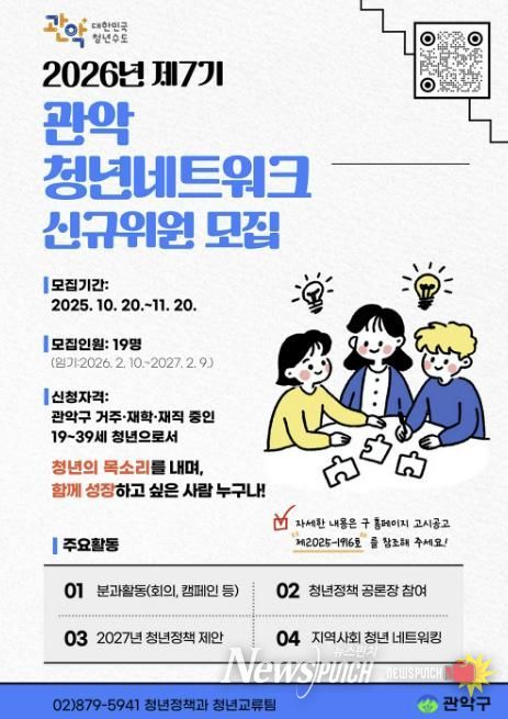 뉴스펀치 김완규 기자 | 청년친화도시 관악구가 청년들이 직접 청년을 위한 정책을 발굴하고 제안하는 '제7기 관악청년네트워크' 위원 19명을 신규 모집한다.