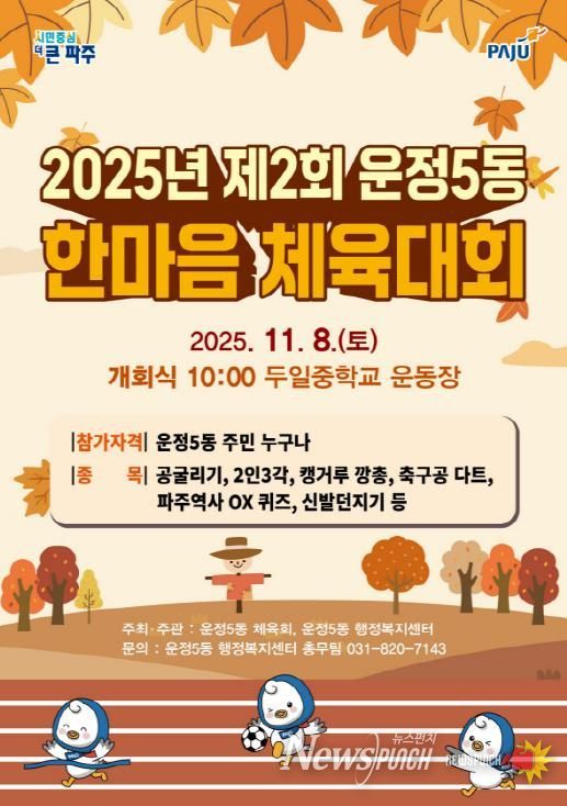 뉴스펀치 김길룡 기자 | 파주시 운정5동은 오는 11월 8일 토요일 두일중학교에서 녩년 제2회 한마음 체육대회’를 개최한다.