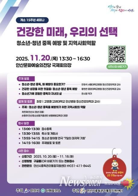 뉴스펀치 김길룡 기자 | 안산시 중독관리통합지원센터는 오는 20일 안산문화예술의전당 국제회의장에서 개소 15주년을 맞아 ‘건강한 미래, 우리의 선택: 청소년·청년 중독 예방 및 지역사회역할’을 주제로 기념 세미나를 개최한다고 4일 밝혔다.