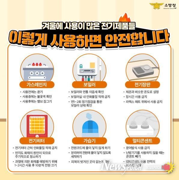 천안서북소방서는 안전한 겨울나기를 위해 ▲가스레인지는 사용 전 환기와 불꽃 상태 확인 ▲보일러는 연통 이상 여부와 안전밸브 점검 ▲전기장판은 라텍스·이불 위 사용 금지 및 장시간 사용 자제 ▲전기히터는 가연물 근처 사용 금지 ▲가습기는 전원코드가 젖지 않게 사용 ▲멀티콘센트는 정격용량(80%) 이하로 사용 등을 시민들에게 당부했다.