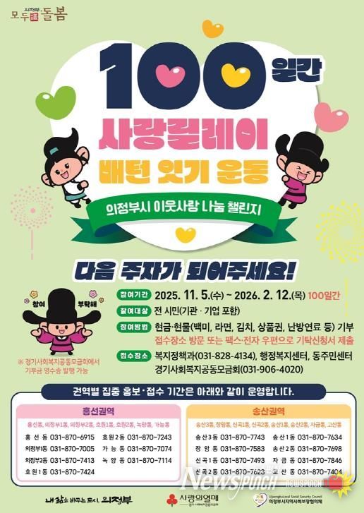 뉴스펀치 김길룡 기자 | 의정부시는 연말연시를 맞아 도움이 필요한 이웃들에게 사랑의 손길을 나누는 이웃사랑 나눔 챌린지 ‘100일간 사랑릴레이 배턴 잇기’를 11월 5일부터 내년 2월 12일까지 100일간 진행한다.