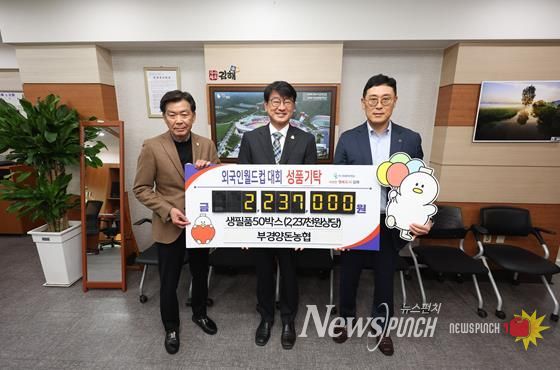 뉴스펀치 김길룡 기자 | 김해시는 4일 부경양돈농협에서 외국인근로자 월드컵대회에 223만원 상당의 생필품을 기탁했다고 밝혔다.