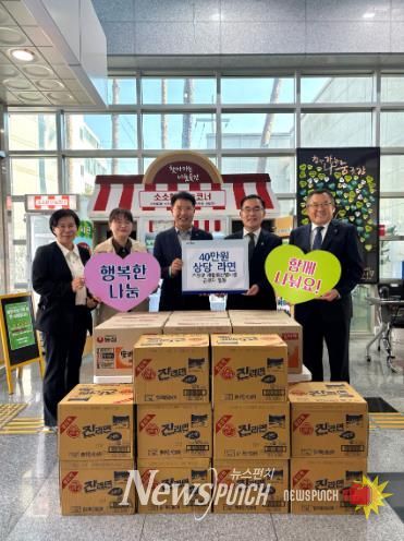 뉴스펀치 김길룡 기자 | 거창군 거창읍 지역사회보장협의체은 지난 4일 거창군 재활용선별시설 근로자 16명 과 관리직원 2명이 거창읍 공유냉장고 ‘찾아가는 나눔곳간’에 40만 원 상당 라면을 기부했다고 밝혔다.