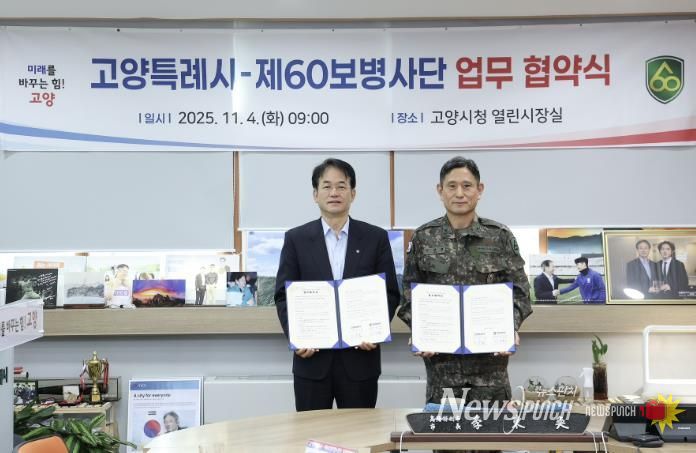 뉴스펀치 김길룡 기자 | 고양특례시는 지난 4일 시청 열린시장실에서 제60보병사단과 지역 안보태세 강화를 위한 업무협약(MOU)을 체결했다고 밝혔다.