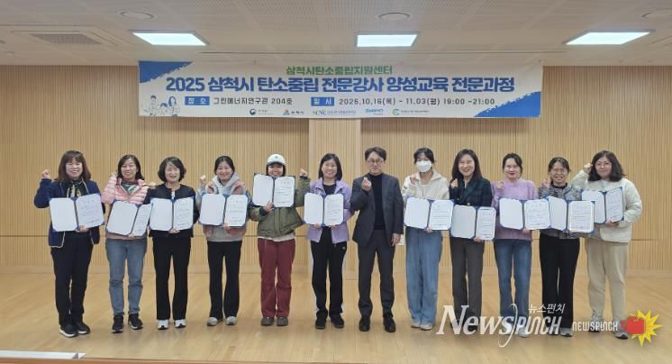 뉴스펀치 김길룡 기자 | 삼척시탄소중립지원센터는 11월 3일 오후 7시 강원대학교 삼척캠퍼스 그린에너지연구관에서 ‘2025 삼척시 탄소중립 전문강사 양성교육 전문과정’ 수료식을 개최했다.