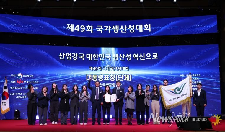 뉴스펀치 김길룡 기자 | 인천국제공항공사(사장 이학재)는 지난 4일 경기 고양시 킨텍스에서 열린 ‘제49회 국가생산성대회’에서 ‘기업·법인 및 단체 부문 종합대상’으로 선정되어 대통령 표창을 수상했다고 5일 밝혔다.