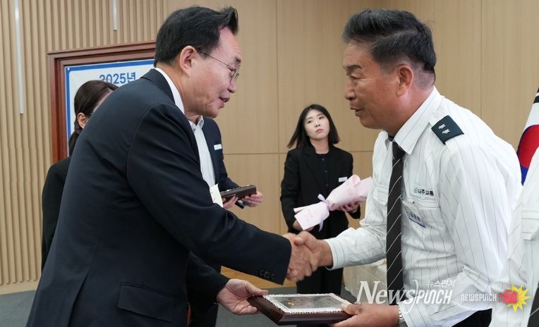 뉴스펀치 김길룡 기자 | 전라남도 나주시는 지난 4일 열린 11월 정례조회에서 친절하고 안전한 운전으로 시민들의 마음을 사로잡은 버스 운전원 2명에게 감사의 마음을 담아 나주시장상을 수여했다고 밝혔다.