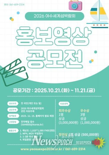 뉴스펀치 김길룡 기자 | (재)2026여수세계섬박람회조직위원회가 11월 21일까지 ‘2026여수세계섬박람회 홍보영상 공모전’을 개최한다.