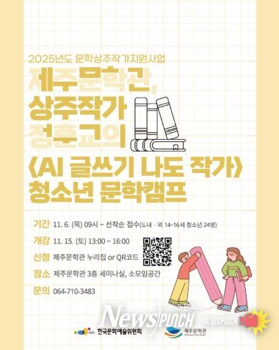 뉴스펀치 김길룡 기자 | 제주문학관이 한국문화예술위원회 '2025년 문학상주작가 지원사업'의 일환으로 상주작가 정훈교의 '인공지능(AI) 글쓰기 나도 작가' 청소년 문학캠프를 개최한다.