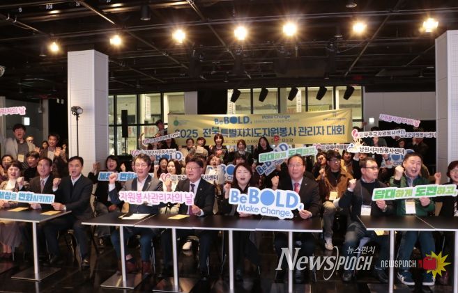 뉴스펀치 정홍균 기자 | (사)전북특별자치도자원봉사센터(이사장 고영호)는 11월 5일 전주시 남부시장 모이장에서 ‘담대하게 도전하고, 세상을 변화시키자!’라는 슬로건 아래'2025 전북특별자치도 자원봉사 관리자대회'를 개최했다.