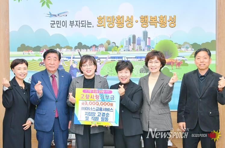 뉴스펀치 김길룡 기자 | 횡성군은 지난 4일 ㈜아너스금융서비스 임직원들이 고향사랑기부금 300만 원을 전달했다고 밝혔다.