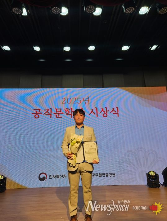 뉴스펀치 김길룡 기자 | 11월 4일 세종시립도서관에서 개최된 ‘2025년 공직문학상’ 시상식에서 합천군 농업유통과에 근무하는 김현기 주무관이 수필 분야에 수상하는 영예를 안았다.